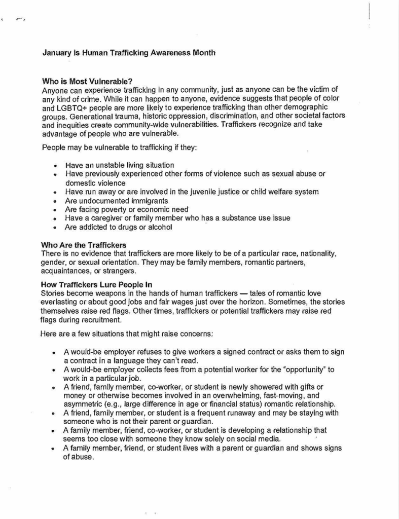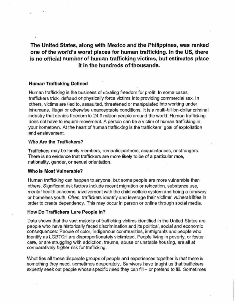 Human traffickers exploit those who may be vulnerable due to psychological or emotional distress, economic hardship, lack of a social safety net, natural disasters, and political instability. For more information, visit: www.dhs.gov/blue-campaign/what-human-trafficking.